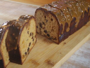 金柑とラムレーズンと黒糖のケーキは、黒糖で甘みを付けたケーキ生地にラムレーズンと金柑コンポートを合わせて、焼き上がりには黒糖とラム酒のシロップ、アイシングも黒糖とラム酒で作ってます。パインに合わせても美味しいかなーっと思いながら今回は、金柑とラムレーズンで。