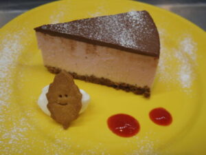 苺とチョコのレアチーズケーキは、チーズケーキ生地に使った苺のピューレをお皿に飾ってお出ししてます。