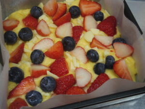 苺とブルーベリーを使ってます。生地に溶け込んだホワイトチョコは練乳っぽいミルキーさがあって、表面に出て焼き色が付いたホワイトチョコはキャラメルっぽくなって、ベリーと良く合います。