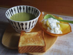 &breadの角食パントースト、うすいえんどうと新玉ねぎのポタージュ、ゴールドキウイヨーグルト。うすいえんどうの見切り品が手に入ったのでポタージュ。新玉ねぎの甘さと合わさってめっちゃ美味しかった。
