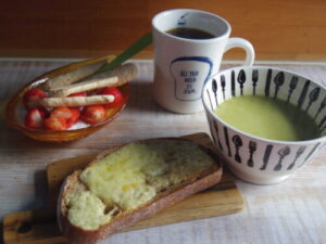 sloのカンパーニュでチーズトースト、うすいえんどうと新玉ねぎのポタージュ、苺メレンゲヨーグルト。