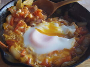 カンパーニュですくって食べるので、卵の黄身はいつもより生っぽい仕上げで。生のトマトで作るシャクシュカが好きで、更にカンパーニュに合わせるのが好き。