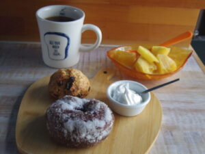 カフェで余ったチョコレートドーナツ、ウェブショップで予備に焼いたココナッツレーズンスコーン、パインヨーグルト。
