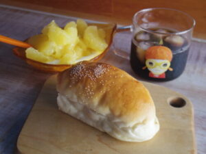 頂き物のココキラリの餡バターパン、ジューシーフルーツヨーグルト。