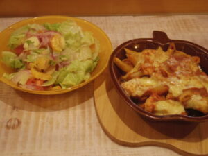 カリフラワーとペンネのカレーグラタン、サラダ。