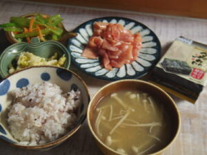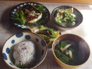 雑穀豆ご飯、鯖の塩麹漬け焼き、小松菜と人参のナムル、高野豆腐と三つ葉の卵とじ、三つ葉とシメジの澄まし汁。ロピアで買った冷凍の鯖の塩麹漬け、なかなか美味しかったのでまた買おう。