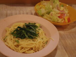 明太子アボカドスパゲティ、サラダ。