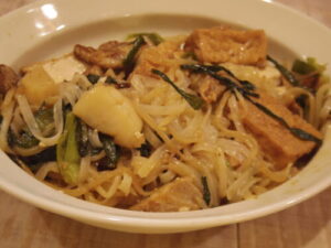 パッタイ。カルディで売ってるパッタイセットで作ったやつ。厚揚げと豚肉、ニラとホタテを入れました。