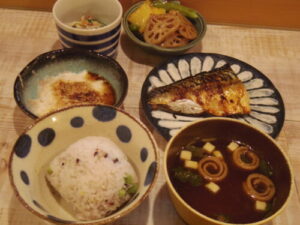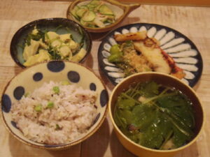 雑穀豆ご飯、赤魚の西京焼き、焼きしし唐、キュウリとカニカマの酢の物、高野豆腐と三つ葉の卵とじ、三つ葉とシメジの澄まし汁。