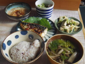 雑穀ご飯、鯖の塩麹漬け焼き、とろろ、高野豆腐と三つ葉の卵とじ、キュウリとカニカマの酢の物、三つ葉とシメジの澄まし汁。とろろご飯と塩サバの組み合わせが大好きなので、久々に食べられて満足。