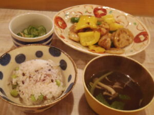 雑穀豆ごはん、鶏と野菜の黒酢炒め、キュウリとカニカマの酢の物、三つ葉とシメジの澄まし汁。酸っぱい系のおかずがかぶってしまった。黒酢炒めには、レンコン、しし唐、黄パプリカとシメジも入れた。