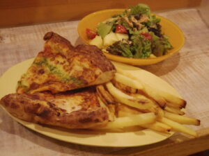 ロピアのピザ、ポテトフライ、サラダ。ポテトフライは冷凍のを揚げて、ピザもカットして冷凍しておいたのを焼いた。ジャンクなものがどうしても食べたい時がある。