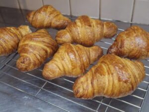 焼成前の冷凍生地クロワッサンを買って焼いた事は何度もあるのだけど、一から作る事は難しそうーーっと一度も挑戦した事が無かったのだけど、休み前でちょっとバターの余裕があって、ずっと挑戦できる日があればなーっと思っていたある日に思い切ってチャレンジ。前日にシートバター作って、パン生地も仕込んでオーバーナイト発酵。準強力粉ってレシピには書いてあったのだけど、はるゆたかと国産のお菓子用の全粒粉を2割くらい混ぜて使ったけど、さっくり仕上がって油っぽくなかったし良かったと思う。初めて作る時はあんまりアレンジしたり材料変えたりしないのだけど、わざわざ準強力粉を買うのは贅沢かなと。あと多分三つ折り一回多かった気がする。
