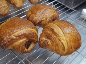 端っこはパン・オ・ショコラに。カフェで売れ残ったブラウニーを巻いたんだけど、めちゃくちゃ美味しかった!一番難しかったのは、成形前の最後に伸ばしてカットするところ。伸ばしたしりから縮んでくるので、思ったサイズよりどんどん小さくなって、大きいクロワッサンが作りたいのにーーっと。めちゃくちゃ楽しかったので、また作りたいと思います。パン・オ・レザンもいいなー。