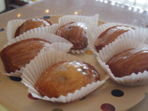 今週も無事に営業が終了しました。ご来店頂きました皆様、有難うございました。今日は、ラスト、ヌガーグラッセ以外のイートインのお菓子が全て完売となりました。カウンター上のお菓子もレモンケーキが完売で、良い感じで終われました。感謝です。写真はブルーベリーとレモンのマドレーヌ。マドレーヌ型を新しくしたので、嬉しくて焼きました。具を入れると真ん中のへそ部分が出にくいのだけど、せっかくブルーベリー余ってるしーっと使いました。レモンの皮で香りを付けた生地に、焼きあがってからアイシング。