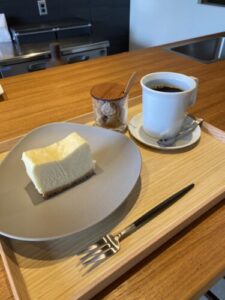 パウンドケーキは持ち帰りにする事にして、イートインはチーズケーキとブランドコーヒー選びました。イイホシユミコさんの器ですね。パウンドケーキは、テイクアウト分はエージレス入りのやつで1週間くらいの日持ちのものでした。テイクアウトの方は4種類あって、イートインは2種類、要冷蔵のケーキはチーズケーキとキャロットケーキがありました。