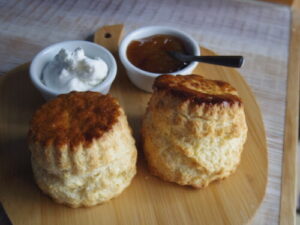 ベーグルとベイク月の英国スコーンと塩バタースコーン。うちのでこぽんラムレーズンジャムで。