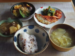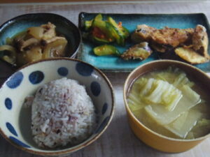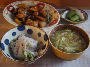 雑穀ご飯、鶏肉と野菜の黒酢炒め、さきいかキムチとキュウリの和え物、浅漬け、みそ汁。黒酢炒めに使った野菜は、カボチャ、椎茸、ピーマン、黄パプリカ、加茂茄子。
