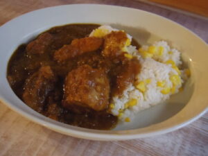 とうもろこしご飯で豚バラかぼちゃカレー。冷凍しておいたカレーを、ヘトヘトの作業後に。
