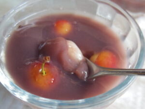 アガーで作る水ようかん。白玉とサクランボ入り。