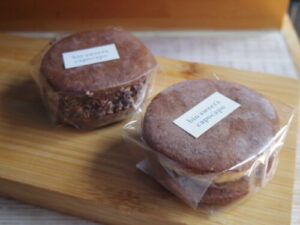 御所西にある菓歩果歩のバターサンド。コーヒーラムレーズンとカカオ。丹後にあるお店だそうで、御所西のお店の方はバターサンドがメインのような感じでした。