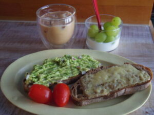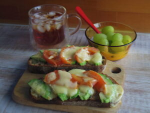 弥栄窯のカンパーニュでアボカドトマトチーズトースト、シャインマスカットヨーグルト。