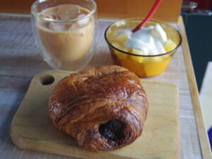 自作のパンショコラ、キウイヨーグルト。