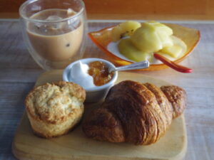 自作のクロワッサンとお店で余ったスコーン、キウイヨーグルト。