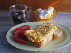 ナカガワ小麦店の山食でオムレツトースト、プチトマト、桃ヨーグルト。