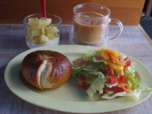 bagle designKの塩バターベーグル、サラダ、ゴールドキウイヨーグルト。