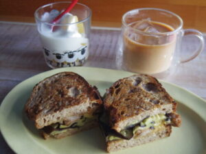 弥栄窯のカンパーニュのホットサンド、ゴールドキウイヨーグルト。サンドの具はローストした茄子、自作のハム、チーズ、トマトソース。