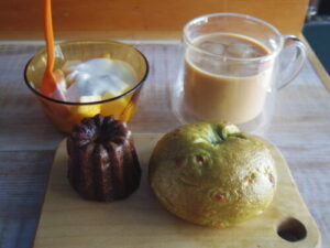 つむぎベーカリーの抹茶とホワイトチョコのベーグル、カフェで余ったカヌレ、桃ヨーグルト。