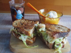 アマムダコタンの食パンでキャベツと茹で卵とキャロットラペのトーストサンド、パインヨーグルト。アマムダコタンは、食パンも美味しかった。