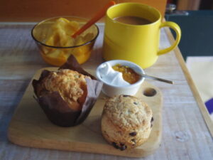 カフェで余ったマフィンとスコーン、パインヨーグルト。