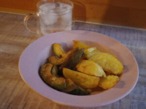 月曜の仕事終わりに、梅ソーダと、揚げた芋(北あかり)、唐揚げ粉まぶして揚げたアボカド。夏はこういうメニューで自家製ソーダと共に、秋冬に比べて夏は暇な分、時間があるのでゆっくりとダラダラとするのが楽しい。メニューは、トルティーヤとワカモレの時もあれば、冷凍ピザや、冷凍餃子、外で買ってきたタコ焼きの時もあって、毎週な訳じゃないけどジャンクでもオッケーな幸せ時間だったりします。この時は、北あかりがめっちゃ美味しいやつで、もう1個分作れば良かったなーっと思いながらチビチビ食べました。