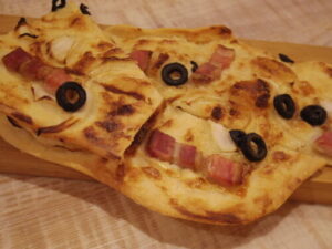 「ねこと私とドイッチュランド」というマンガがあって、ベルリンを舞台にした日常ほんわかマンガなのだけど、猫のむぎ君が可愛くて何度も読み返してます。そして、その漫画の4巻にフラムクーヘンというピザっぽい食べ物が出てくるのです。漫画内にレシピがあったので焼いてみた。美味しいけど何か既視感が、と思って調べたら、フランスのタルトフランベと同じとの事で、なるほどーっと。冷蔵庫にあったベーコンと玉ねぎ、オリーブを乗せたけど、サワークリームを塗るのが特徴で、ナツメグもあったのでレシピ通りに入れました。自家製ソーダと一緒にお疲れ様ーーっと。