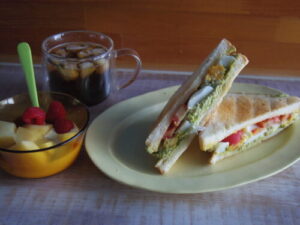 つむぎベーカリーの食パンでトーストサンド、キウイラズベリーヨーグルト。サンドの具はアボカドツナディップ、トマト、茹で卵。