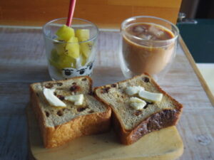 ナカガワ小麦店のレーズン食パンでバタートースト、キウイヨーグルト。