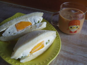 つむぎベーカリーの食パンでフルーツサンド。シャインマスカットと宮崎マンゴー。マンゴーがめちゃくちゃ甘くて美味しくて、安いペリカンマンゴーにもう戻れないーっとなってたら、この後アレルギーが発覚して、あんまりたくさん食べられなくなったのでした。