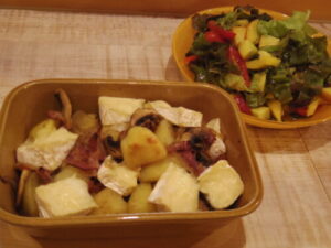 届いたその日の夕飯に、カマンベールを使う。マッシュルームと玉ねぎとペッパーハムを炒めて、茹でたジャガイモの上にカマンベールと共に乗せてオーブンで焼いたグラタン的なものとサラダ。
