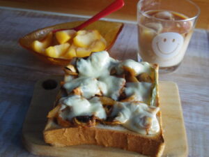 ピザトースト、黄金桃ヨーグルト。
