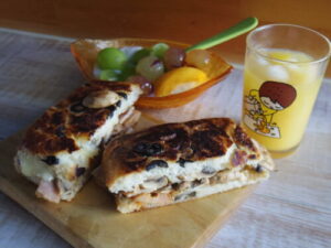 自作のオリーブフォカッチャでマッシュルームとベーコンとチーズのパニーニ、黄金桃とマスカットと巨峰ヨーグルト。