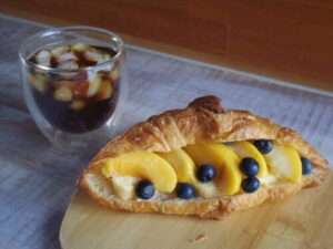 コストコのクロワッサンで、カスタードと黄金桃ブルーベリーサンド。