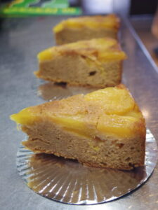 写真はパインと黒糖のアップサイドダウンケーキ。沖縄県産の黒糖を使っています。