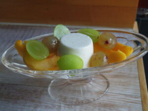 カフェで余ったパンナコッタ使って、豪華にフルーツ盛り。使ったのは黄金桃とシャインマスカット、ピオーネ。