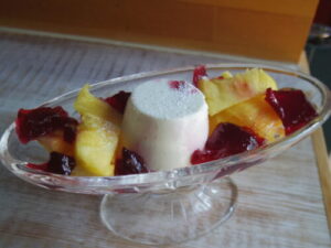 台湾パインとチェリーのゼリーを散らして。カフェでもこっちの器でフルーツ盛り盛りでやってもいいかも。
