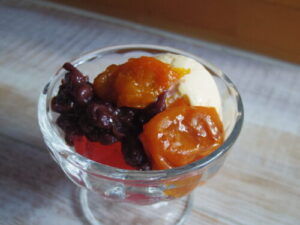 自作のあんずみつ豆的なもの。すもものシロップゼリーを寒天に見立てて、その上に自作の粒あん、バニラアイス、アンズの蜜煮。白玉あったら最高だったけど、美味しかったー。アンズの蜜煮、お菓子にも使ったけど、コンポートよりも手間かかるだけあって、濃いーー。