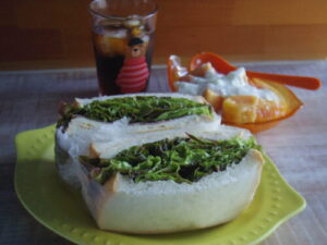 マーマンの食パンでハム卵レタスサンド、ワッサーヨーグルト。レタスの存在感にハムも卵も見えないけど、ハムはお肉屋さんのちょっと良いペッパーハム、玉子はオムレツにしてから挟んでます。