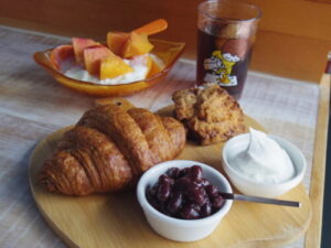 つむぎベーカリーのクロワッサン、カフェで余ったキャラメルスコーン、ワッサーヨーグルト。