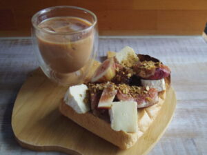 ひつじの山食で、いちじくカマンベールトースト。カフェで余ったピスタチオを上からたっぷり散らして。今まで白カビだとブリー買う事が多かったけど、カマンベールの方が使い切りやすいかも。